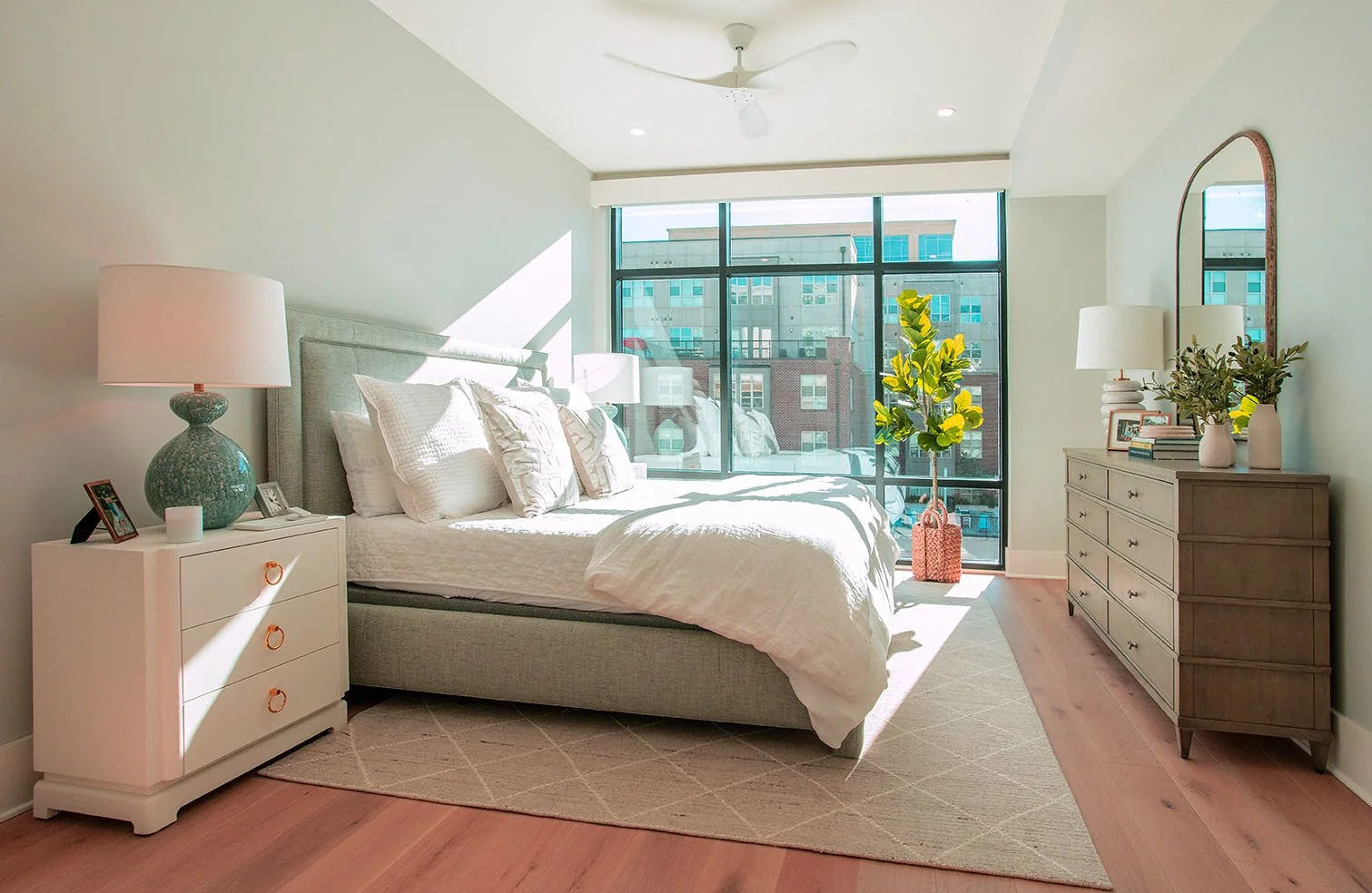A beautifully designed modern bedroom featuring an upholstered bed, soft layered bedding, large floor-to-ceiling windows, warm natural light, and contemporary furnishings that create a calm, inviting atmosphere.