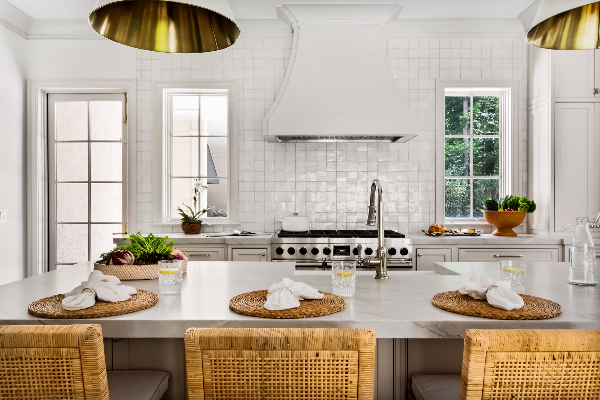 A beautifully designed luxury kitchen featuring a spacious waterfall-edge island, woven barstools, brass pendant lights, white tile backsplash, and premium stainless-steel appliances—crafted by Will Johnson Building Company.